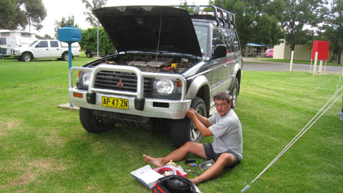 Thomas schaffte es gerade noch, das defekte Blinkerteil von meinem Känguruh Crash im trockenen zu flicken. Dann musste unser Zelt mal wieder zeigen, ob es dicht ist. Es hielt einigermassen dicht, wir konnten eine kleine lecke Naht-Schwachstelle finden. Diese muss dann, wenn das Zelt trocken ist, mit einer Art Leim repariert werden. Dieser wird in die Nähte gefüllt und macht so die kleinen Nadellöcher dicht. – An anderen Stellen hat das bis jetzt wunderbar gehalten.