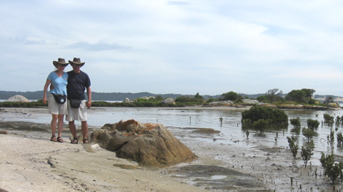 Windstill und teilweise bewölkt. Zur Abwechslung besuchten wir den nördlichen Teil des Wilsons Promontory NP. Beim Millers Landing gibt es Mangroven, die am weitesten südlich gelegenden der südlichen Hemisphäre. Weiter südlich gibt es auf der Südhalbkugel keine Mangroven mehr. Das Meer war total ruhig und ohne Wind war es schon fast heiss. Ein Bad hätte uns gerade gepasst, wegen den Mangroven lässt sich aber dort schlecht baden. Über das Rocky Point Lookout gingen wir wieder zurück zum Parkplatz und fuhren zum endlosen Strand bei den Cotters Lakes. Die Cotters Lakes sahen wir aber nicht – entweder waren sie so überwachsen oder trocken…