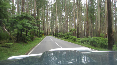 Bilder: Unterwegs nach Mansfield, ein spannender Eukalyptuswald mit Farnbäumen. Abendstimmung und ganz alleine auf dem Campingplatz im Eildon Lake National Park.