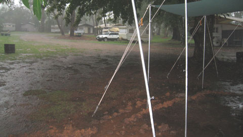 Bild: Es giesst wie aus Kübeln. Dämme und Gräben verhindern den Wassereinbruch in unser Zelt.