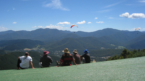 Bild: Drei Doppelsitzer sind unterwegs. Die anderen Piloten am Startplatz sind eher unschlüssig und beobachten das Ganze. Die Tafel am Startplatz Mystic in Bright (797 m hoch (ASL = above see level), 487 m Höhendifferenz bis zum Landeplatz (AGL = above ground level) und das Ganze auch in Fuss).