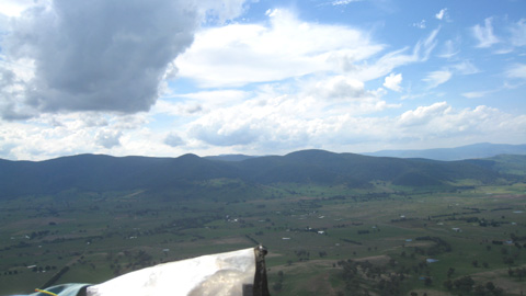 Ein weiterer Flugtag in Corryong. Wie auf meinem Flugfoto zu sehen war es überall grün, überall sumpfig und alle Wasserlöcher voll. Die Sonne heizte ein und schwupps, die Wolken machten überall Schatten.