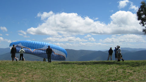 Bild: Das übliche Startprozedere am Startplatz des Mt. Elliot in Corryong, der letzte Comp-Pilot startet am Startplatz. Die Wolken sahen nicht schlecht aus.