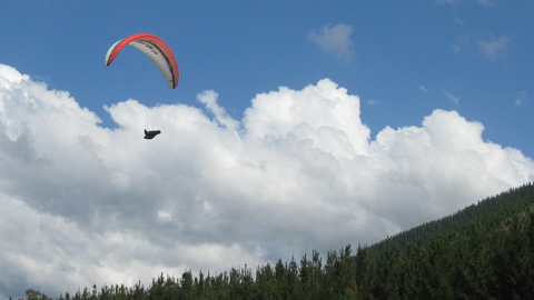 Bild: Thomas im Landeanflug auf die Landing Zone in Bright. Schöne Wolken im Hintergrund, aber zu feucht…