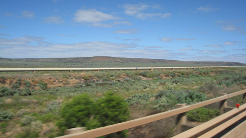 Bild: Auf der Fahrt kurz nach Port Augusta Richtung Eyre Peninsula – eine lange Pipeline entlang der Strasse/Bahnlinie und ein Armeetrainingsgebiet bei den Hügeln.