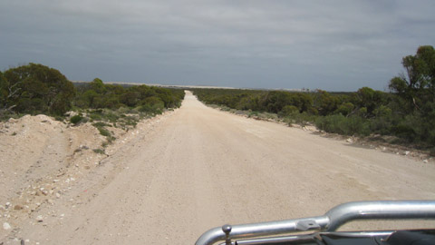 Bild: Die Schotterpiste nach Fowlers Bay, in der Ferne sieht man ganz knapp die riesigen Sanddünen von Fowlers Bay.