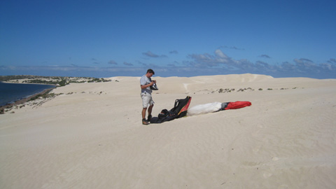 Bilder: Thomas auf der Düne. Leider hatte es zuviel Wind, es wäre aber definitiv ein guter Platz zu soaren.