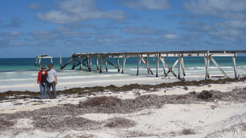 Mit dem Fliegen bei Eucla wurde es dann doch nichts, die Klippe ist dort nirgends zugänglich. Wir hätten zum Fliegen also noch einmal etwa 45 km zurück über die Grenze nach SA fahren müssen, zum anderen Lookout. Das liessen wir dann aber bleiben und gingen stattdessen zum alten Telegrafenhaus in den Sanddünen und zum alten Pier am Strand.