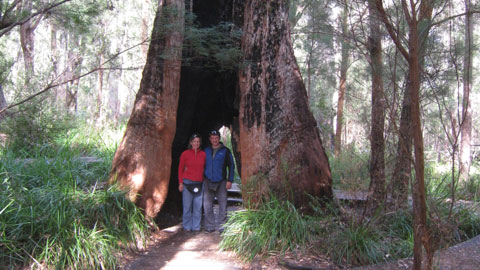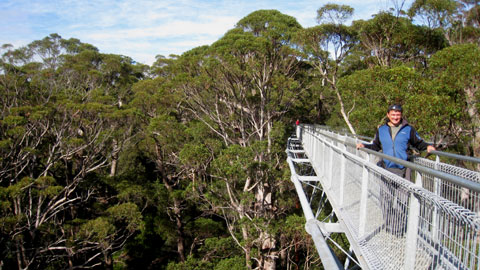 Bilder: Thomas auf dem “Tree Top Walk” Steg, 40 m über Boden (die Bäume waren ca. 60 m hoch). Bei einigen der alten Red Tingles konnte man in den hohlen Stamm stehen (nur dort wo es erlaubt ist sollte man das tun und sonst nicht!).