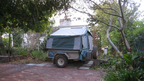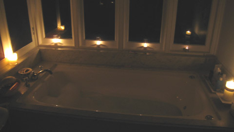 Bilder: Unser Campingplatz im Backyard. Sonnenuntergangs-Wein im Mosemann Park (im Hintergrund das Zentrum vom Perth mit den Wolkenkratzern). So sieht ein Spezial Candlelight Sprudelbad für uns im neuen Badezimmer des Hauses aus (wir müssen wohl einen ziemlich gestressten Eindruck hinterlassen haben).