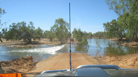 Bilder: Das Hotel und die Tankstelle an der Gascoyne Junction, oder besser was noch davon noch übrig war (das Wasser des Flusses stand bis zum Dach des Hauses im Hintergrund). Die erste ernsthafte Flussüberquerung, Thomas prüfte zuvor den Wasserstand.