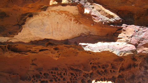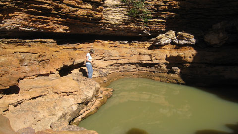 Bilder: Felsformation im Drapers Gorge mit Aboriginie Symbolen – gleich daneben gab es überall Versteinerungen: Muscheln, Pflanzenwurzeln… und Lavaformationen mit verschiedenene Steinen eingeschlossen – alles Millionen von Jahren alt. Beim Wasserpool zuhinters im Drapers Gorge. Wenn es regnet, gibt es hier auch einen imposanten Wasserfall.