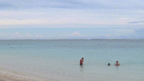 Dort stiegen wir am beschriebenen Punkt ins Wasser, schwammen ca. 100m hinaus und liessen uns mit der Strömung Richtung Norden über die Korallenbänke treiben. Wunderbar! Schon kurz nach unserem Startpunkt scheuchten wir einen riesigen Stachelrochen (natürlich unbeabsichtigt) aus seiner Sandtarnung am Boden auf. Er zog maiestätisch unter uns durch und verschwand im leicht trüben Wasser. Wir schwebten dann mit der leichten Strömung über viele grössere und kleinere Korallenbänke mit unzähligen farbigen Fischen und genossen das warme Wasser. Rechtzeitig vor der beschriebenen Sandbank schnorchelten wir dann wieder Richtung Strand, um nicht von der immer stärker werdenden Stömung mitgenommen zu werden. Das ist wichtig, weil gleich bei der Sandbank die Ströumung von der anderen Seite der Bucht dazukommt und man von dort unweigerlich an die äussere Riffkante und dann ins offene Meer gezogen würde. Kurz vor unserem Ausstieg an den Strand spürten wir dann die Stömung auch richtig gut und probierten auch einmal dagegen zu schwimmen: Beim Ausstiegspunkt bei der Sandbank konnte man sich gegen die Stömung mit den Flossen gerade noch so an Ort halten.