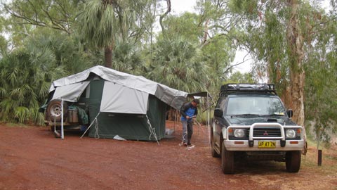 Bild: Unser Zelt wird von Thomas wieder einmal regensicher gemacht.