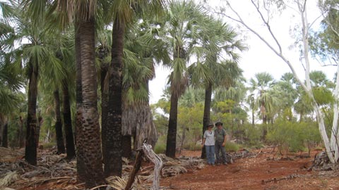 Bild: Wir zwei inmitten einer Gruppe von Millstream Palmen (Livistona alfredii (lat.) oder Garliwirri (aboriginal)), einer in Australien beheimateten Fächerpalmenart.