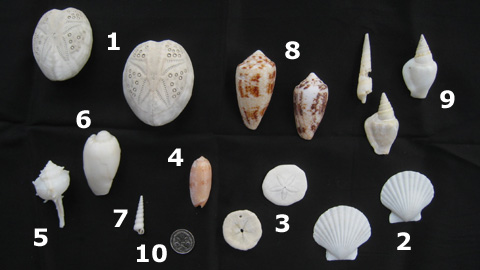 Bilder: Drachen steigen lassen am Eighty Mile Beach, die Anderen fischen. Meine Muschelsammlung nach 4 Stunden harter Suche: 1 Herzigel/heart urchin 2 Kammmuschel/scallop 3 Sand Dollar/sand dollar 4 Australische Olive/Australian olive 5 ??? 6 Australische Walzenschnecke (ein etwas kleines und abgewetztes Exemplar ohne grosse Hörnli und Farbe) 7 Doppelbohrerschnecke/duplicate auger (ohne Garantie) 8 Netz Kegelschnecke/textile cone (lebendig = giftig) 9 die eine ist wohl die abgebrochene Variante der zwei anderen, dann könnte es ein Glockenklöppel/bell clapper sein 10 eine 5 Cent Münze als Grössenvergleich, diese Münze hat ca. 1.5 cm Durchmesser.