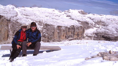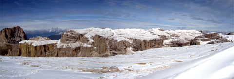 Nachdem die Wetterprognose eigentlich gut angesagt hatte entschieden wir uns heute trotzdem für eine Wanderung. Der Nordwind drückte auf die Flugstimmung – deshalb machten wir uns auf in den Schnee auf den Sas Pordoi auf 2950m. Der Schnee hatte sich dort oben bereits so breit gemacht dass wir das Bähnli nahmen…