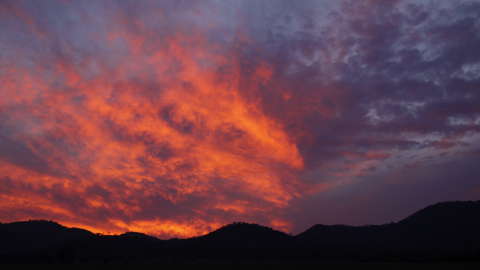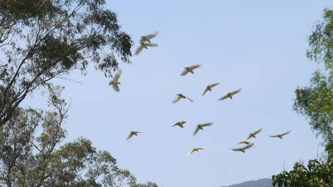 Bilder: Ganz friedlich – der Besuch eines Schwarmes Gelbhauben-Kakadus am Morgen. Jetzt war es Zeit, zu packen… nur runter vom Berg! 15 Minuten später bei der Rückfahrt. Dann eine Sicht von 50 m (zu diesem Zeitpunkt war das Gröbste schon vorbei – der Wind und die Blitze) . Abendrot nach dem Sturm…