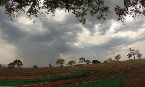 Gegen Mittag gab es dann ein paar schöne Quellwolken uns wir beschlossen, zum Startplatz zu fahren. Oben angekommen herrschten ganz gute Bedingungen, vielleicht ein wenig zu stark. Ume 14:30 Uhr sah es ganz passabel aus, wir packten unsere Schirme aus und machten uns bereit. Und dann ging es buchstäblich rasend schnell. Die Wolken wurden dunkler und dunkler – ich installierte meine Kamera für eine Zeitrafferaufnahme – und schon nach 15 Min. zuckte der erste Blitz Richtung Farm. Nix mehr mit Fliegen… lieber schleunigst vom Berg runter. Die Strasse kann nämlich bei Regen sehr gefährlich werden…