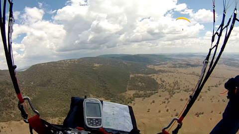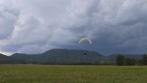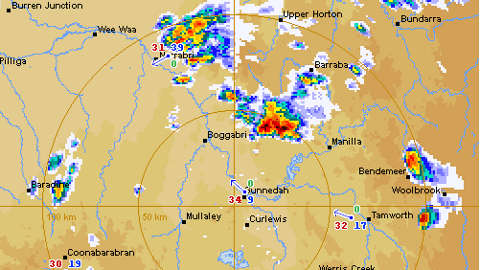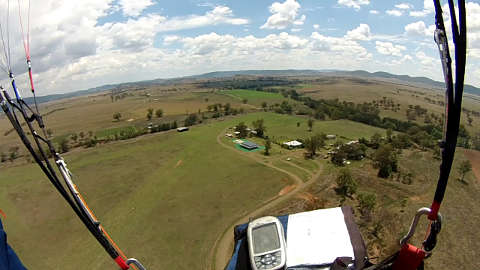 Bilder: (21.12.2012) Endlich wieder Thermik fliegen und die Füsse baumeln lassen. Die Gewitterzelle braut sich im Hintergrund zusammen. Landeanflug auf den Airstrip der Farm in Manilla. Thomas Landung vor der grossen Wolke… Das Radarbild von www.bom.gov.au kurz nach unserer Landung.