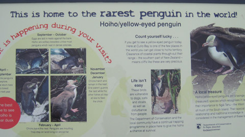Bilder: Das Yellow-Eyed Penguin Paar auf dem Weg zur Strandböschung. Eine Info-Tafel über die seltensten Pinguine der Welt am Strand.