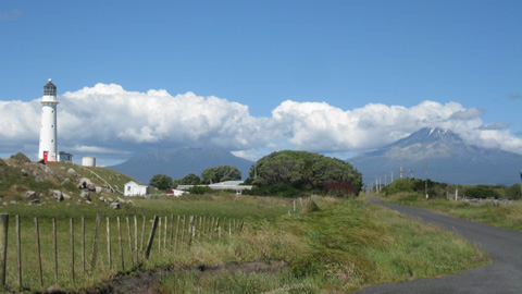 Bild: An der Wolkenbasis “Cloudbase” am Mt.Egmont. Am Cape Egmont, mit dem Egmont Lighthouse und dem Mt. Egmont im Hintergrund (Spitze leider in einer Wolke). Der westlichste Punkt der Nordinsel Neuseelands.