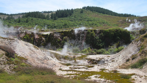 In Taupo gings dann gleich weiter zu den Huka Falls, einem sehr eindrücklichen Wasserfall gespeist vom Lake Taupo. Von da machten wir einen Abstecher zu den “Craters of the Moon”. Dort kann man für 6$ pro Person einen ca. 45 Min. Rundgang um Krater und um dampfspeiende und fauchende Löcher machen. Dafür liessen wir uns richtig Zeit, bevor wir dann noch einen kurzen Blick auf die Röhren des Geothermie-Kraftwerk warfen.