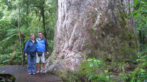Bild: Neben dem 7.-grössten Kauri Baum(stamm), dem Yakas, sehen wir schon ziemlich klein aus… Auf diesem Bild ist das Ausmass dieser Bäume einigermassen zu erahnen.