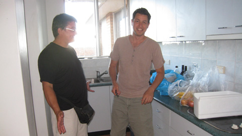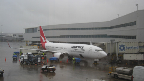 Bilder: Unser Quantas Flieger steht in Auckland bei strömendem Regen bereit. Willkommen bei Ned in Sydney (in der Küche, die Sonne scheint momentan noch…)