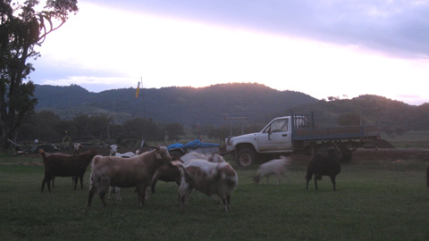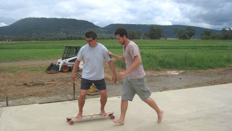 Bild: Thomas versucht sich im Skateboarden auf der Betonplatte des sich im Bau befindenden neuen Clubhaus. Ned unterstützt ihn tatkräftig. Bein Sonnenuntergang streunen die Geissen über die Farm und fressen alles ratzekahl ab was ihnen zwischen die Zähne kommt.