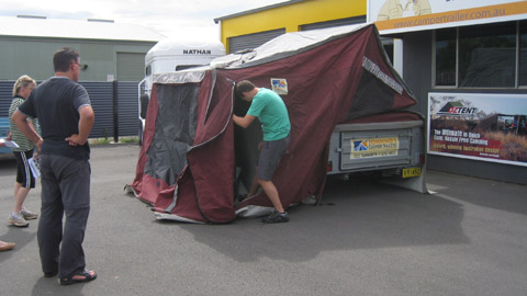 Da gab es unter anderem einen Haarschnitt für Thomas, neue Turnschuhe und Flip Flops, allerlei Kleinzeugs und am Schluss eine Demo bei einem Camper Trailer Hersteller. Wie stellt man denn so ein Ding überhaupt auf und wie wieder ab?