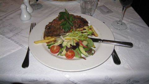 Bild: Unser Abendessen (mit weisser Tischdecke) konnte sich sehen lassen. Und das Zimmer war auch nicht schlecht!