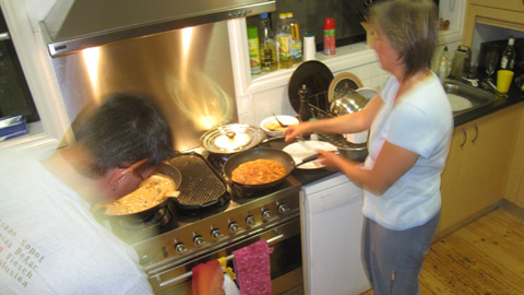Bild: Wir bei der Kocherei für den Swiss Food Evening. Meine Röschti sieht schon ganz gut aus…