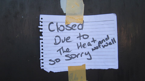 Bilder: Schild an einem Laden in Manilla (Geschlossen auf Grund der Hitze und nicht so gesund, so sorry). Sonnenuntergangs-Spektakel am West Startplatz des Mt. Borah (die Känguruhs und die Gewitterwolken sieht man hier leider nicht, sie waren aber überall).