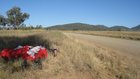 Mir wurde es nicht schlecht und ich konnte heute sogar weiter fliegen als Thomas und ihn schlagen. Nach 63 km landete ich mitten auf der Strasse (siehe Bild). Die Wiese daneben hatte nämlich einen richtig heftigen Zwickdraht. Das konnte ich sogar aus der Luft erkennen… Zudem war das Gras etwa so hoch wie ich selber hoch bin. Und auf der Strasse war weit und breit kein Auto zu sehen.